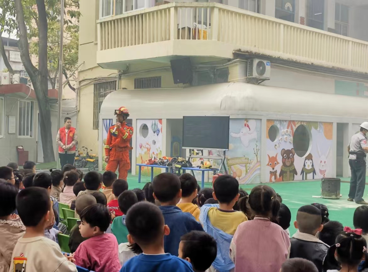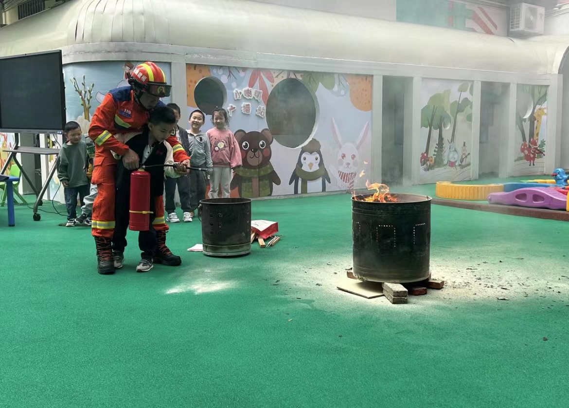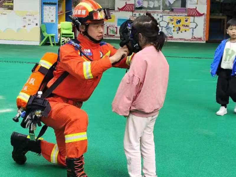 活动现场,邀请了消防员,消防员根据幼儿的年龄特点,用浅显易懂的语言,讲解火灾发生的原因以及其危害,重点放在与孩子们平时生活有关联的“着火了怎么办?”“日常生活不玩火”“消防报警电话是多少?”等内容做了重点讲述。让孩子们学习火灾来临时的自救方法,认识相关标志。消防员还向教职工进行消防安全培训,一旦遇到突发火灾怎样正确使用消防器材扑救初起火灾,讲解逃生方法,提高火灾疏散能力。
