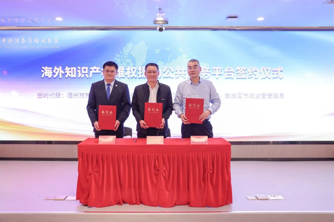 党组成员、副局长、三级调研员、市知识产权局局长何朝晖、鼓楼区市场监督管理局党组书记、局长、区知识产权局局长郑明强、海丝中央法务区福州片区代表陈皞现场签订海外知识产权维权援助公共服务平台三方共建协议。