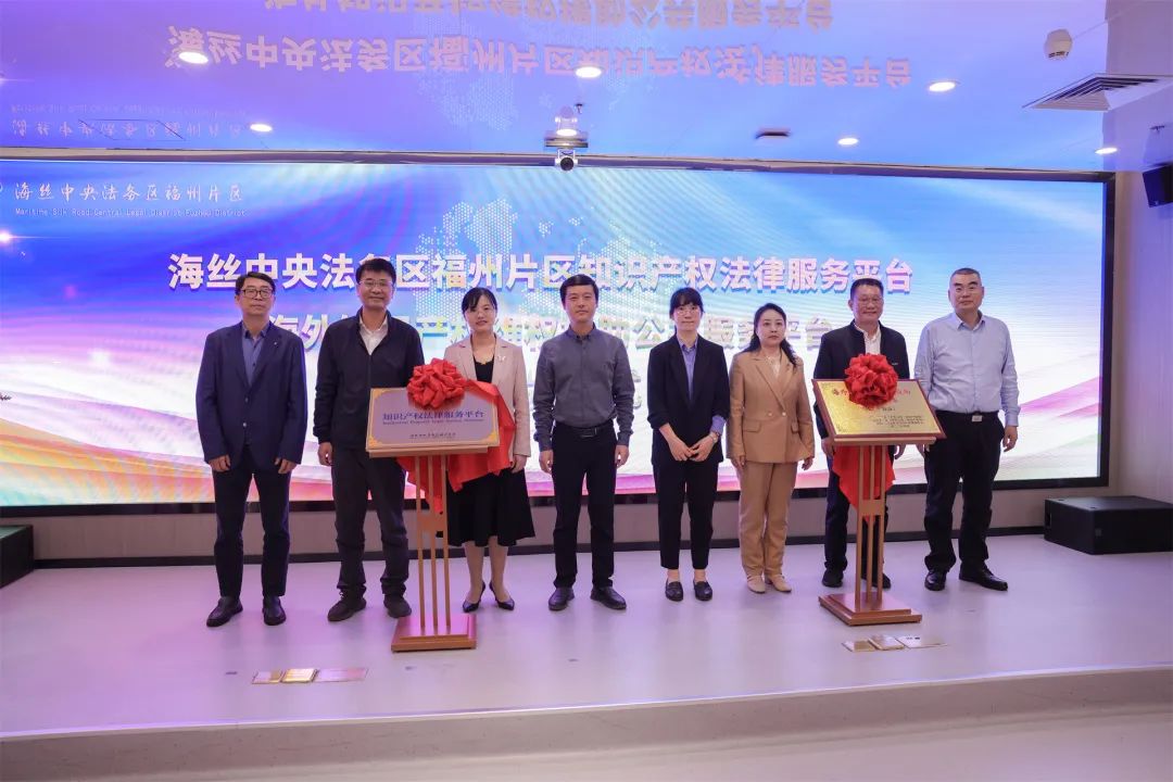 福建省高级人民法院民三庭副庭长郑鸿,福州市司法局副局长陈建新,鼓楼区委常委、政法委书记、福州市海丝中央法务区工作领导小组办公室副主任刘钟,鼓楼区司法局党组书记、局长张宝荣为海丝中央法务区福州片区知识产权法律服务平台成立揭牌。