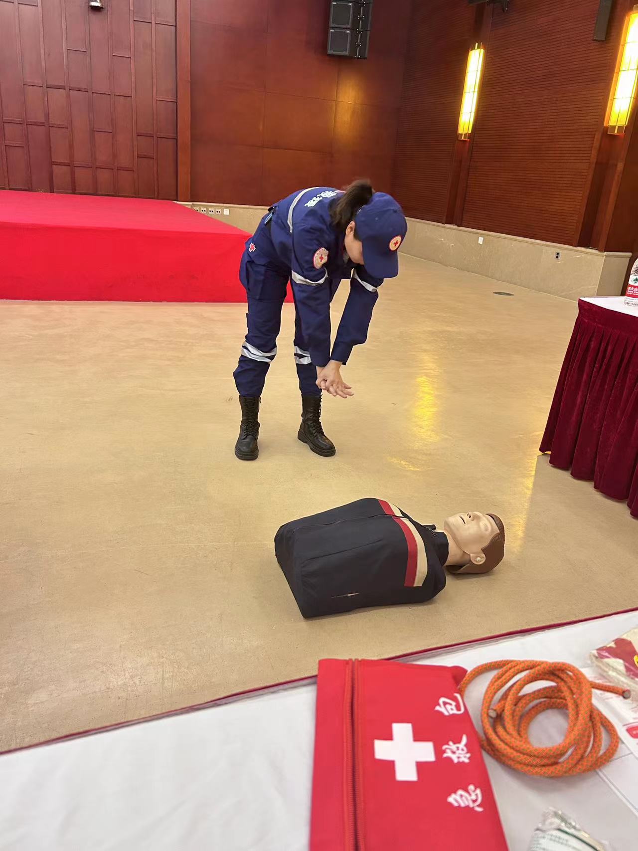 活动现场,蓝豹减灾中心队长通过图文并茂的课件、真实案例,分析从自救、互救技能科普地震的逃生知识,现场教授逃生绳结和简易担架的制作讲解了AED除颤仪的正确使用方法,并演示了心肺复苏、海姆利克急救方式。随后在场人员分成多个小组进行“沉浸式”模拟演练指导大家模拟人进行实践操作,参与心肺复苏、止血包扎、固定、搬运等创伤救护相关培训,演练过程紧张有序,现场学习热情高涨