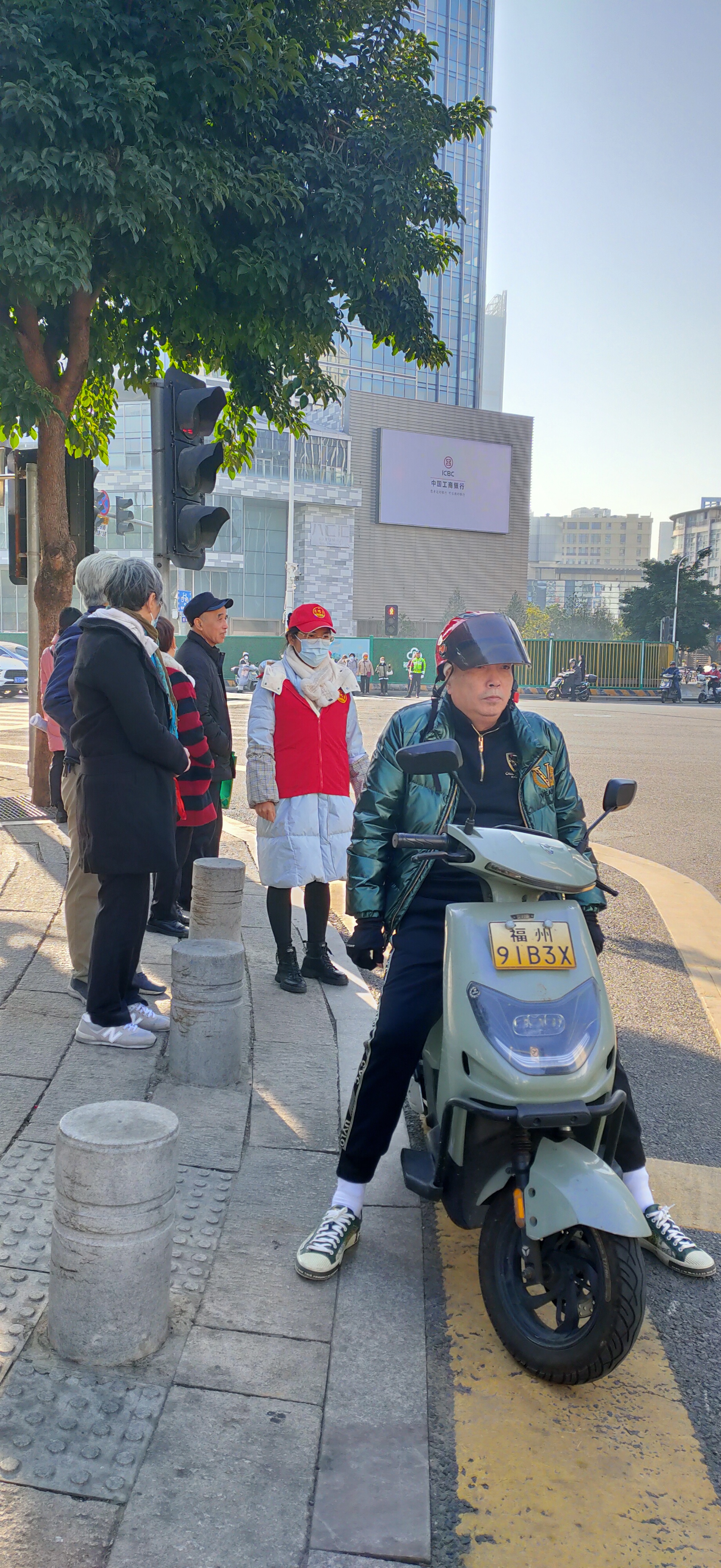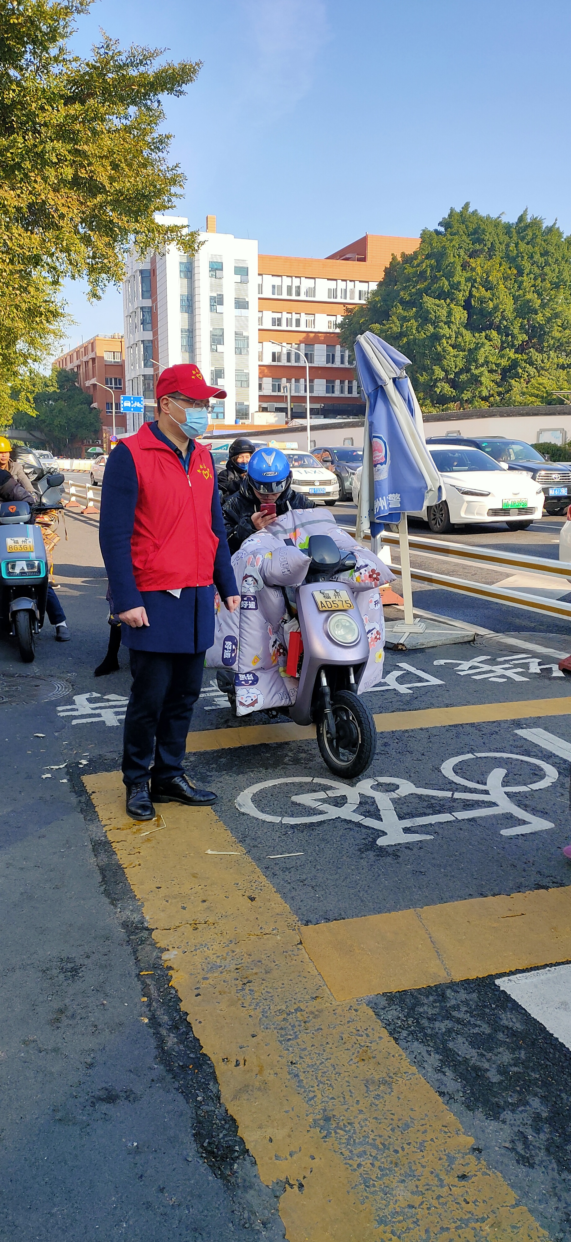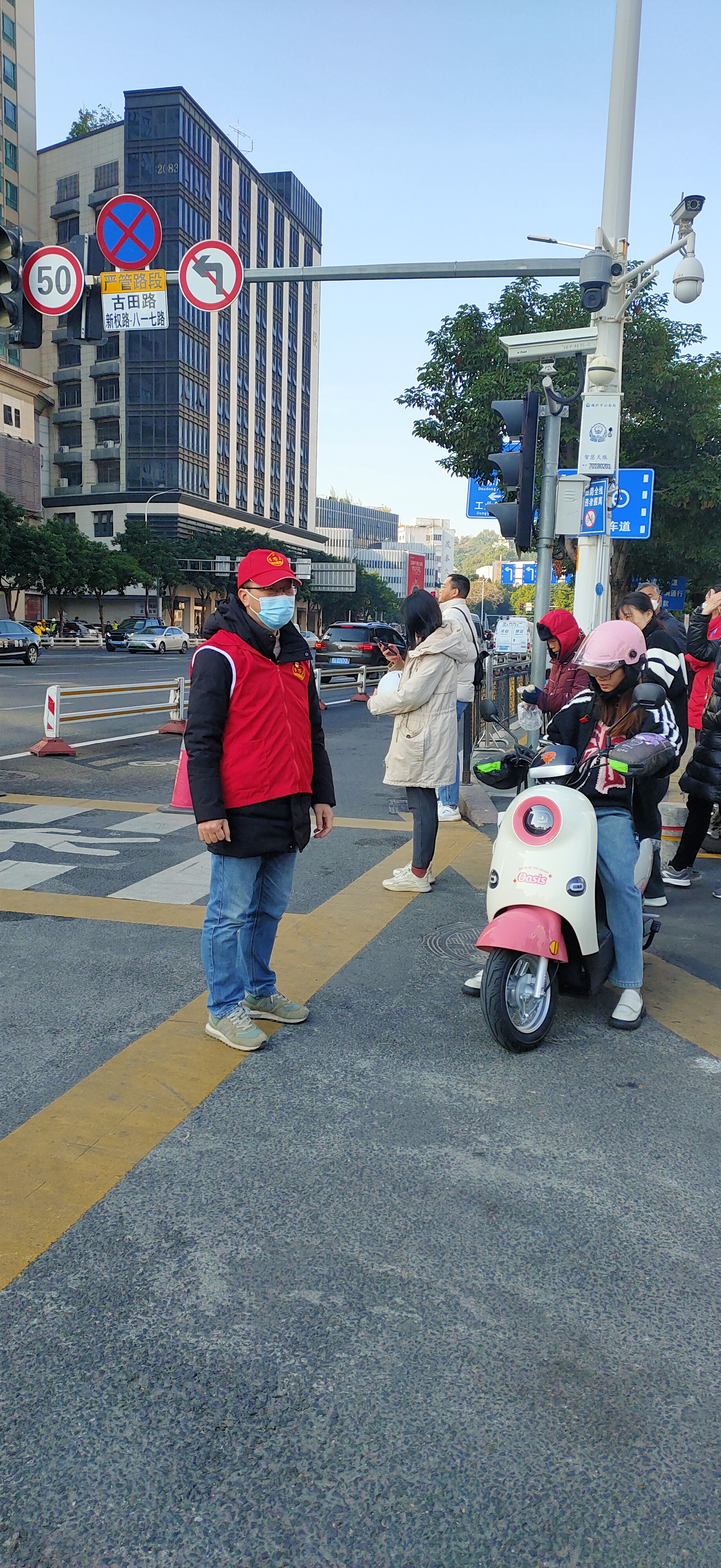 “您好,请佩戴好头盔。”“您好,请等绿灯亮起后再通行。”早高峰时段,由市知识产权发展保护中心组成的志愿者队伍,分别在古田路与新权路口协助维持交通秩序。他们身穿红马甲,在交警的带领下进行文明交通劝导,纠正乱穿马路、闯红灯、不戴头盔等不文明交通行为,教育过往行人遵守交通规则,注意交通安全,引导大家自觉摒弃交通陋习、抵制交通违法行为,做文明交通的践行者和维护者。