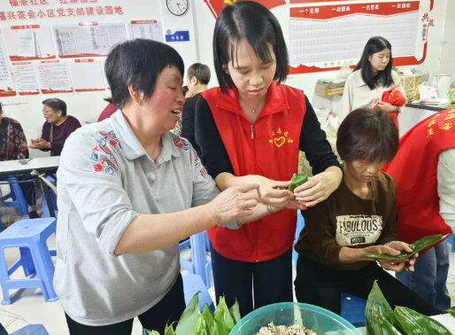 在福茶社区居家养老活动中心,志愿者协同社区人员有条不紊完成粽子食材准备工作,到了包粽子比赛环节,志愿者与居民们拿起桌面上的粽叶、糯米、蛋黄、瘦肉、香菇以及扎绳,展现出各自的娴熟技艺,一双双灵巧的手在粽叶与食材间舞动,粽叶的清新香气与晶莹透亮的糯米相得益彰,形态各异、满载祝福的粽子随之诞生,现场气氛温馨而融洽。