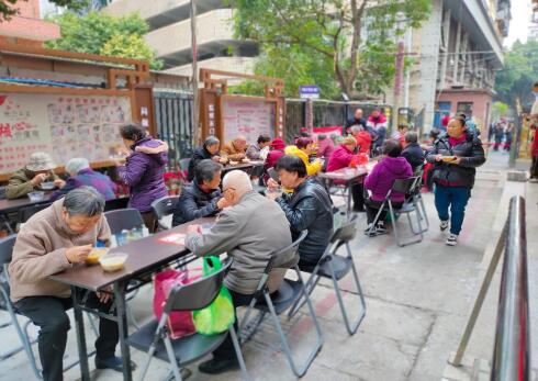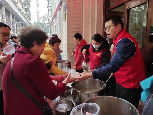 活动现场,社区工作人员及中心志愿者邀请社区居民共同参与,为社区老人提供热腾腾的拗九福“粥”,让群众有参与感,让老人有幸福感,温情满满。