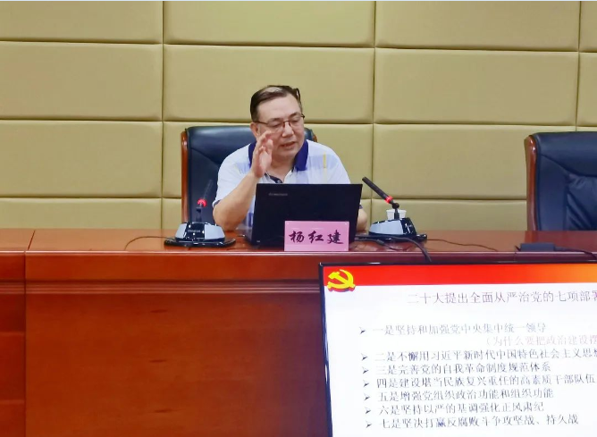 杨红建教授以《继往开来 奋进新时代——学习贯彻党的二十大精神》为题,重点宣讲党的二十大主题及重要意义,系统回顾党的十八大以来十年非凡成就,深入对如何把握好历史主动,坚持好、运用好习近平新时代中国特色社会主义思想的世界观和方法论进行讲解,从中国式现代化的特点、中国式现代化的本质要求、推进中国式现代化的重大原则、持之以恒推进全面从严治党等方面,全面阐释了党的二十大报告重要内容,促进市局党员干部学深悟透党的二十大精神。